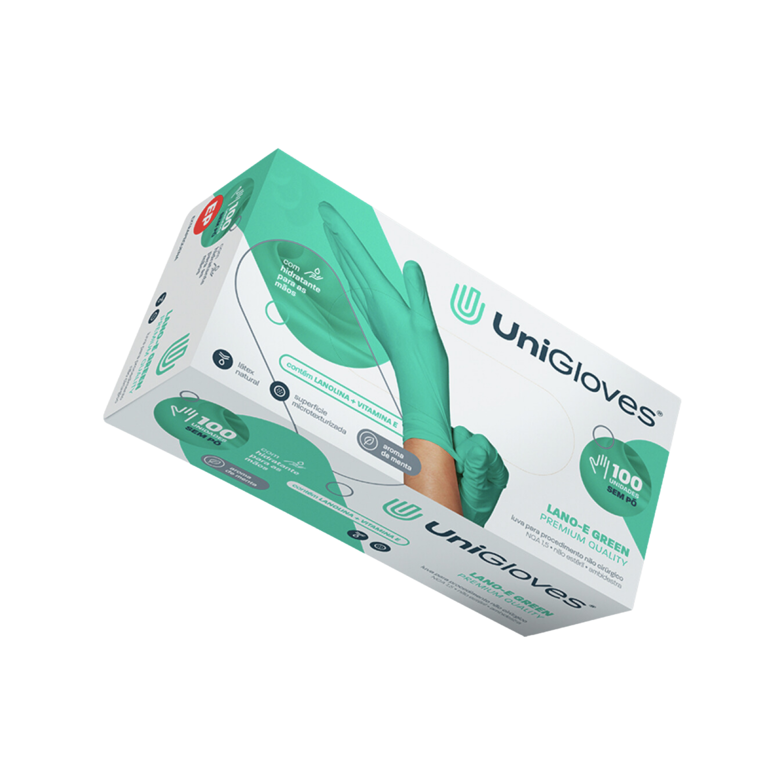 Luva unigloves lano-e green com hidratante.Caixa com 10 cartuchos 100 luvas cada.Total de 1.000 luvas na caixa fechada.